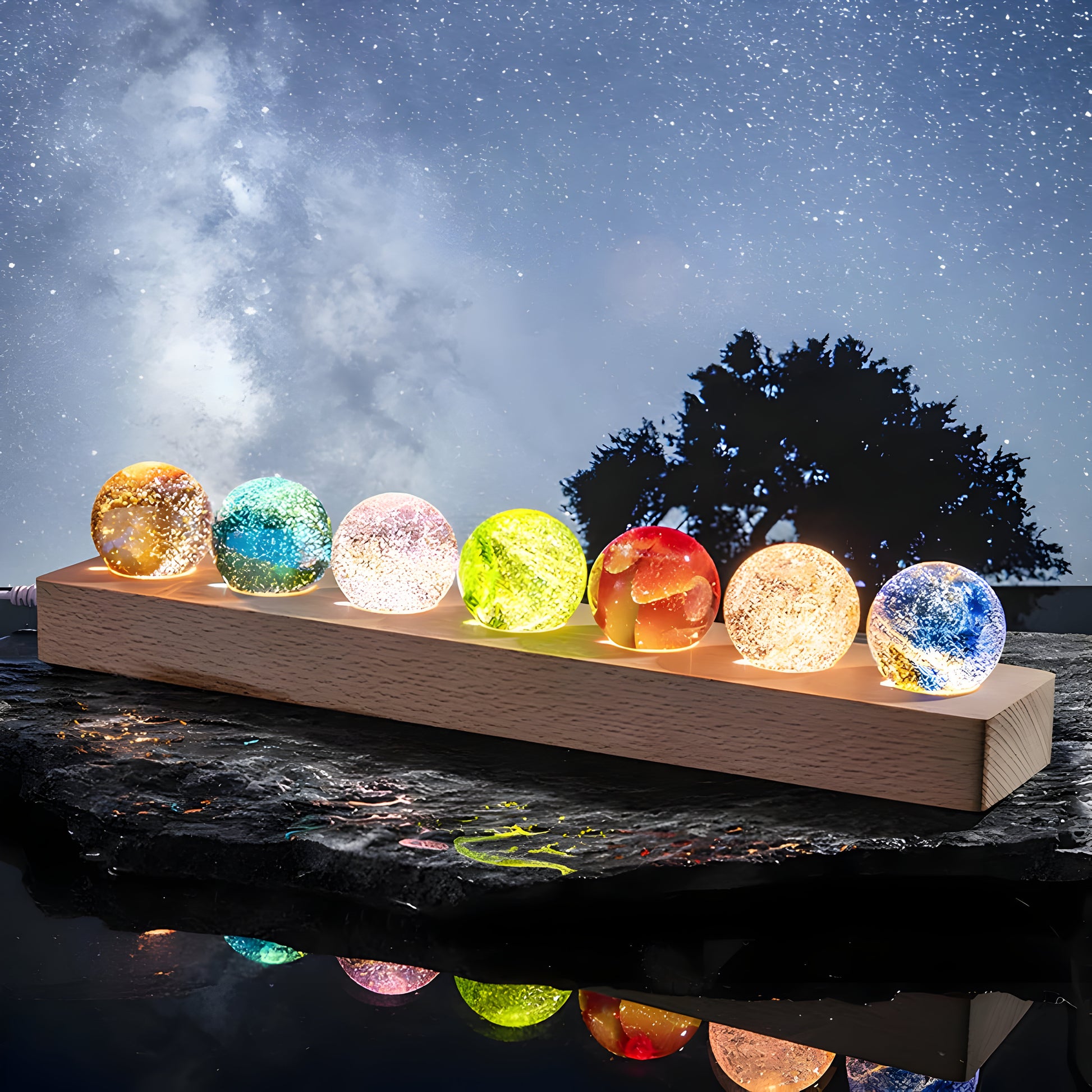 Verwandeln Sie Ihr Zuhause in einen Ort voller Charme mit dieser einzigartigen LED Tischlampe. Die Kombination aus natürlichem Holz, edlem Glas und sanftem Farbwechsel-Licht sorgt für eine warme, entspannende Stimmung. Jede Kugel leuchtet in unterschiedlichen Farben und schafft ein bezauberndes Dekolicht, das Wohnzimmer, Schlafzimmer oder Büro stilvoll ergänzt.